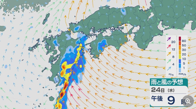 今後の雨と風の予想ですが、24日の夕方以降は鹿児島県や宮崎県、さらに四国で発達した雨雲がかかる