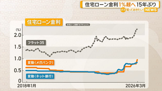 大手銀行の来月の住宅ローン金利は、変動の平均値が1%を超える見通しとなりました。15年ぶりの水準です。 住宅ローン診断「モゲチェック」 塩澤崇さん 「この1%という水準ですが、住宅ローンの返済者の毎月返済額、どれくらいのインパクトになるかと言うと(返済期間35年5000万円借り入れの場合)だいたい月5000円~6000円増える」 住宅ローン利用者の8割が、金利が上がるたびに返済額が増える「変動型」を選んでいるとされていますが、今後は「固定型」を選ぶ人が増えると専門家は予想しています。 国土交通省も先週、金利上昇で住宅ローンの返済が将来の家計の負担になる恐れがあることから、金利リスクを理解することが重要だと呼びかけました。 「変動金利を選ばれた方については、今後の金利上昇への備えも非常に大切。リスク許容度がある方は株式投資ということもして、インフレを家計の中に取り込んで追い風にしてしまう。こういった考え方も一つ備えとしてはあるのではないか」 (2026年3月30日テレビ朝日放送分より)
