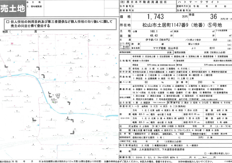 伊予鉄バス 南井門バス停 停歩8分 接道 南西側 5.3m 公道 接面13.2m・西側 5.3m 公道 接面11.2m