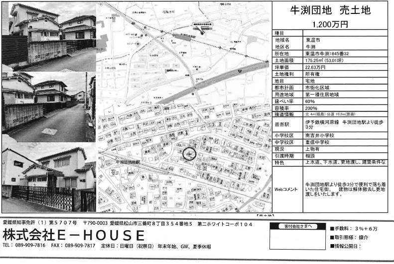 伊予鉄道横河原線 / 牛渕団地前駅 徒歩3分 接道 北側 4.0m 公道 接面10.2m