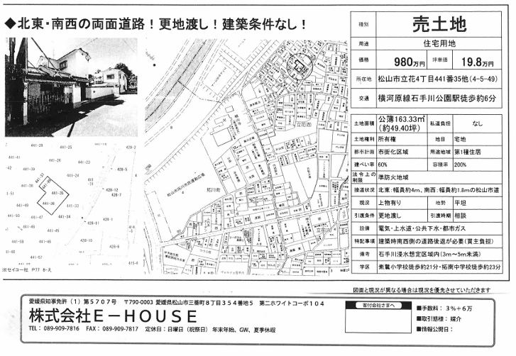 伊予鉄道横河原線 / 石手川公園駅 徒歩6分 北東 4.0m 公道 接面14.0m・南西 1.8m 公道 接面9.0m・二方道路