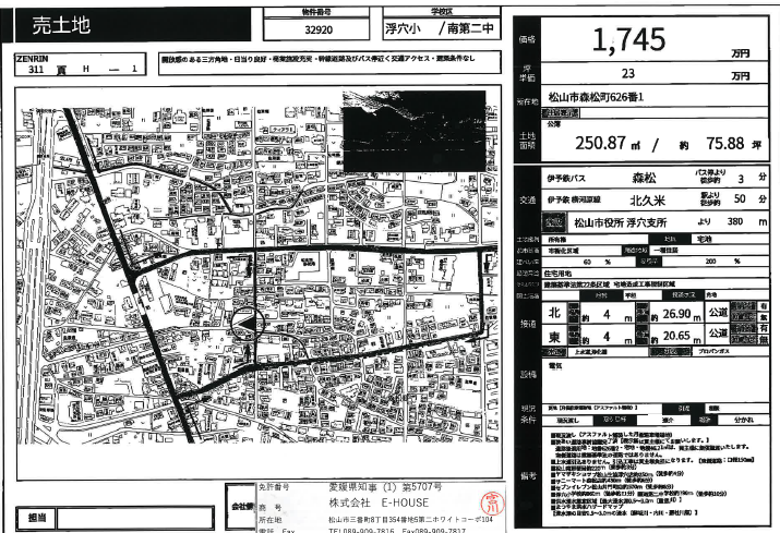 伊予鉄バス 森松 バス停 徒歩3分 接道 北 4.0m 公道 接面26.9m・東 4.0m 公道 接面20.6m・二方道路
