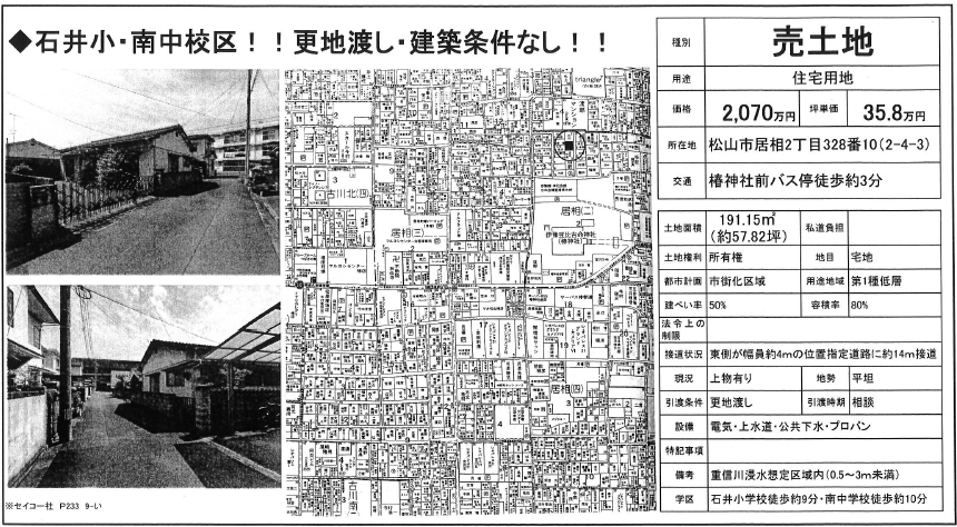 伊予鉄バス 椿神社前 停歩3分 接道 東 4.0m 私道 位置指定有 接面14.0m