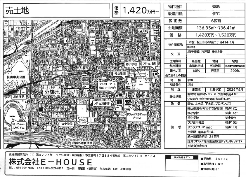 市坪駅まで徒歩2分♪1駅で松山駅まで行けますね♪市坪ICも近くだから外環状へのアクセスもあっという間!松山中央公園もすぐ近く♪市街地 生活便利 人気の椿小。新規分譲全6区画