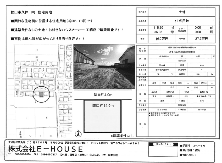 伊予鉄道郡中線 / 余戸駅 徒歩23分 接道 北 側 4.0m 私道 接面14.9m