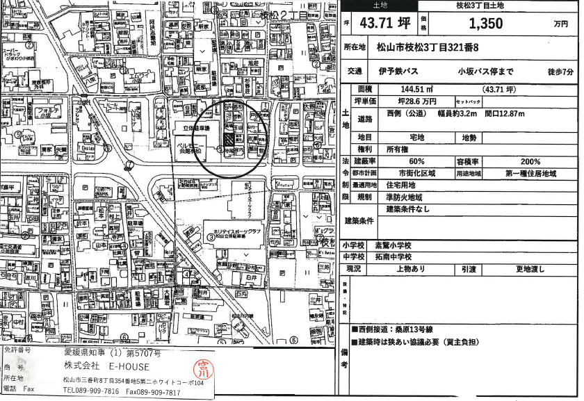 伊予鉄バス 小坂 バス停 徒歩7分 接道 西 側 3.2m 公道 接面12.8m