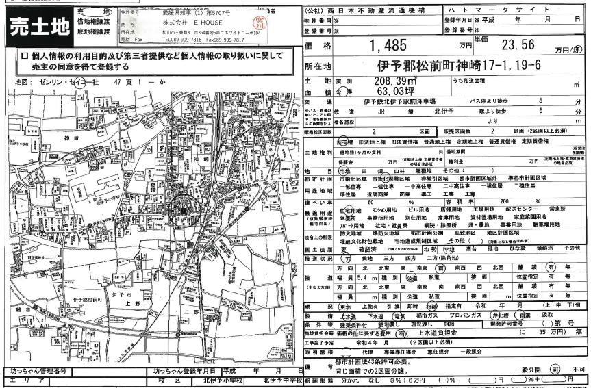 JR予讃線 / 北伊予駅 徒歩4分 接道 南 5.4m 公道 接面11.0m