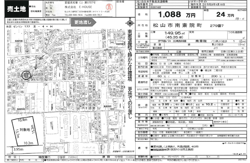 伊予鉄バス 南斎院バス停 徒歩1分 接道 南 3.9m 私道 位置指定有 接面10.2m