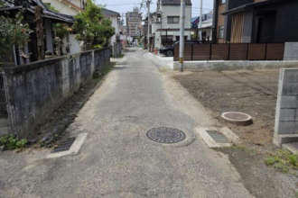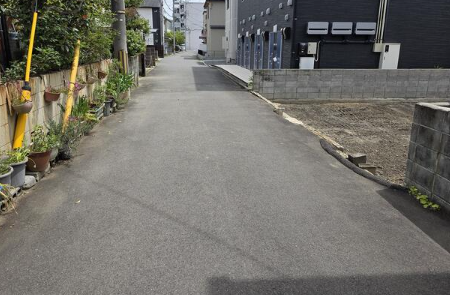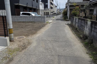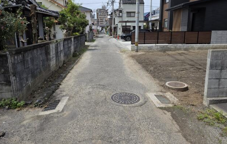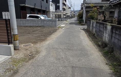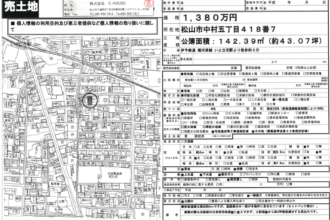 伊予鉄道横河原線 いよ立花駅より徒歩約3分 ●南面と北面の二方道路 前面道路は現況約4mですが、道路部分の一部が本物件に含まれています(セットバック部分)。建築の際は当該部分は有効宅地面積に算入できず、上記面積から約2坪程度減少する見込みです。