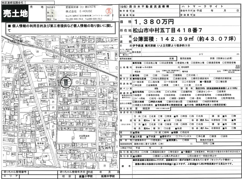 伊予鉄道横河原線 / いよ立花駅 徒歩3分 接道 南 4.0m 公道 接面8.5m・北 4.0m 私道 位置指定有 接面7.6m