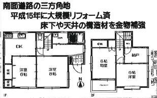 南面道路の三方角地 平成15年に大規模リフォーム済 床下や天井の構造材を金物補強。リフォーム済ですが中古物件のため、気になる点があるかもしれません。