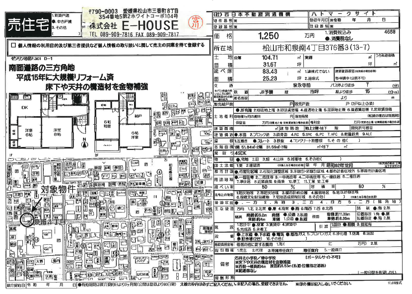 ●所在地/松山市和泉南4丁目376-3 ●交通/ JR予讃線 / 市坪駅 徒歩15分 ●用途地域 第一種低層住居専用地域 市街化区域 ●販売戸数/1戸 ●地目/宅地 ●建蔽率/50% ●容積率80% ●建築工法/木造 スレート瓦 1階51.84㎡ 2階31.59㎡ 昭和62年12月築 ●設備/上水道・下水道 ●学区/石井北小・椿 中 ●取引形態/仲介
