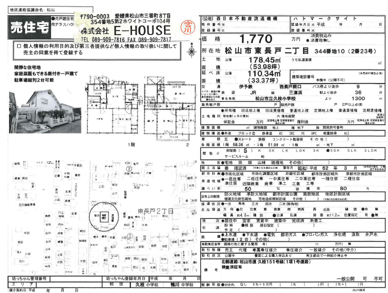 ●所在地/松山市東長戸2丁目344-10 ●交通/伊予鉄バス / 西長戸南口 停歩9分  ●用途地域 第一種低層住居専用地域 市街化区域 ●販売戸数/1戸 ●地目/宅地 ●建蔽率/50% ●容積率80%  ●建築工法/木造 ●設備/上水道・下水道 ●学区/久枝 小・鴨川 中 ●取引形態/仲介