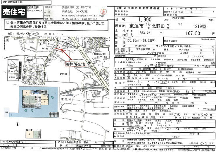 ●所在地/東温市北野田1219番 ●交通/ 伊予鉄 伊予鉄道横河原線 / 梅本駅 徒歩14分  ●用途地域ー 市街化調整区域 ●販売戸数/1戸  ●地目/宅地 ●建蔽率/70% ●容積率80% ●建築工法/木造 ●設備/上水道・下水道 ●学区/南吉井小・重信 中 ●取引形態/仲介