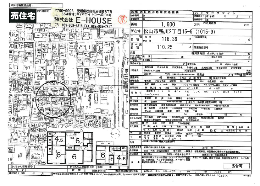 ●所在地/松山市鴨川2丁目15-6 ●交通/伊予鉄道本町線 / 本町六丁目駅 徒歩3000m ●用途地域 第一種低層住居専用地域 市街化区域 ●販売戸数/1戸 ●地目/宅地 ●建蔽率/50% ●容積率80% ●建築工法/木造 ●設備/上水道・浄化槽 ●学区/潮見 小・鴨川 中 ●取引形態/仲介