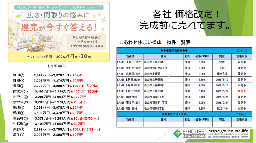 4月のキャンペーンや価格改定情報など気になる物件が在りましたお問合せください。